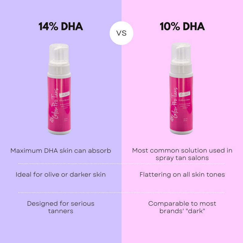 DHA (Dihydroxyacetone) is the active ingredient that creates the tan by reacting with amino acids in the top layer of skin to mimic natural sun color; while most self tanners use lower levels (around 5–8%), GlowPro contains 2–3x more DHA, matching the 10–14% concentrations used by pros for deeper, longer-lasting results that don’t rinse away after the first shower.